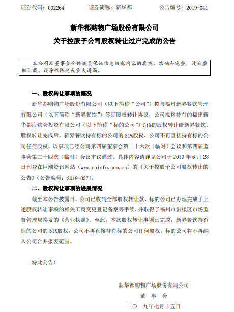 7月16日,新華都購物廣場股份有限公司發布“關于控股子公司股權轉讓過戶完成“的公告:與福州新界餐飲管理有限公司簽訂股權轉讓協議,新華都將持有的福建新華都海物會投資有限公司51%的股權轉讓給新界餐飲,新華都不再直接持有標的公司(即海物會)任何股權,標的公司將不再納入新華都合并報表范圍。