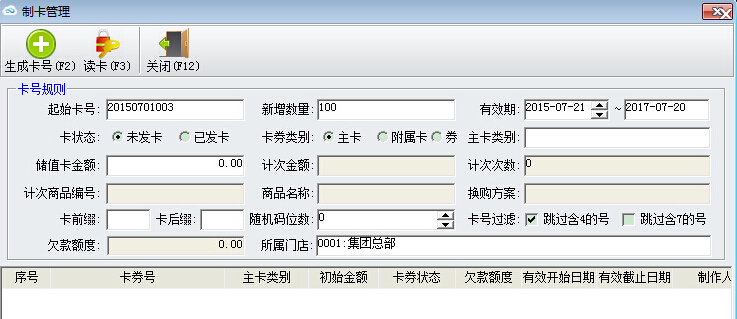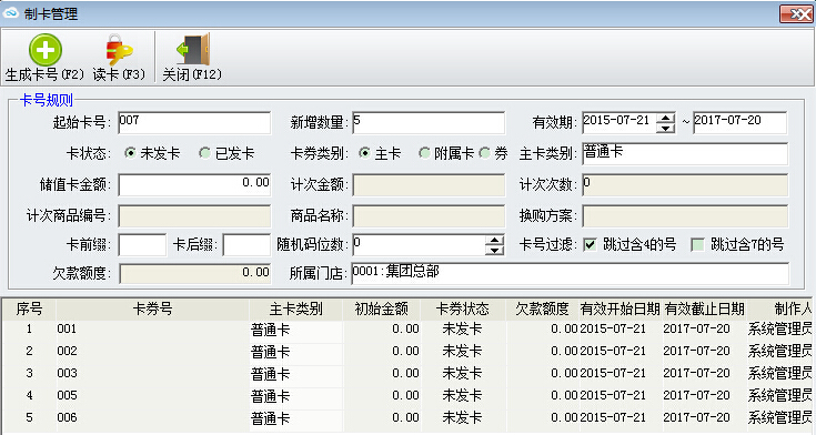 2.在卡號規則內填入相關信息,如起始卡號,新增數量,有效期,卡券類別(如果選擇主卡,需要選擇主卡類別),還可以選擇卡號過濾,跳過含4的號或者跳過含7的號