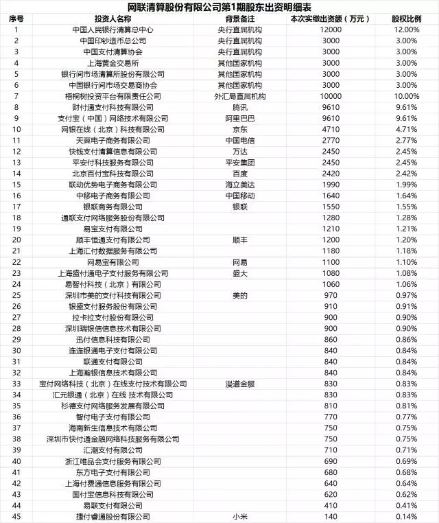 值的注意的是,在《通知》下發(fā)前兩天,一份包括央行清算總中心、支付寶、財(cái)付通等在內(nèi)的45家機(jī)構(gòu)和企業(yè)的《網(wǎng)聯(lián)清算有限公司設(shè)立協(xié)議書(shū)》被曝光。根據(jù)協(xié)議,網(wǎng)聯(lián)注冊(cè)資本20億人民幣,央行為第一大股東,下屬7家子公司出資7.6億,占股比例達(dá)到37%,支付寶和財(cái)付通分別持股9.61%,這兩大市場(chǎng)巨頭未能占據(jù)主導(dǎo)地位。
