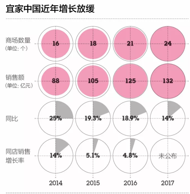 宜家的營收增速在放緩。2017年,宜家中國銷售額約為132億元人民幣,同比增長14%。盡管仍保持著兩位數的增長,但這個數字已低于2016財年的水平。2016財年,宜家在中國的銷售額是117億元,增速為19.4%。